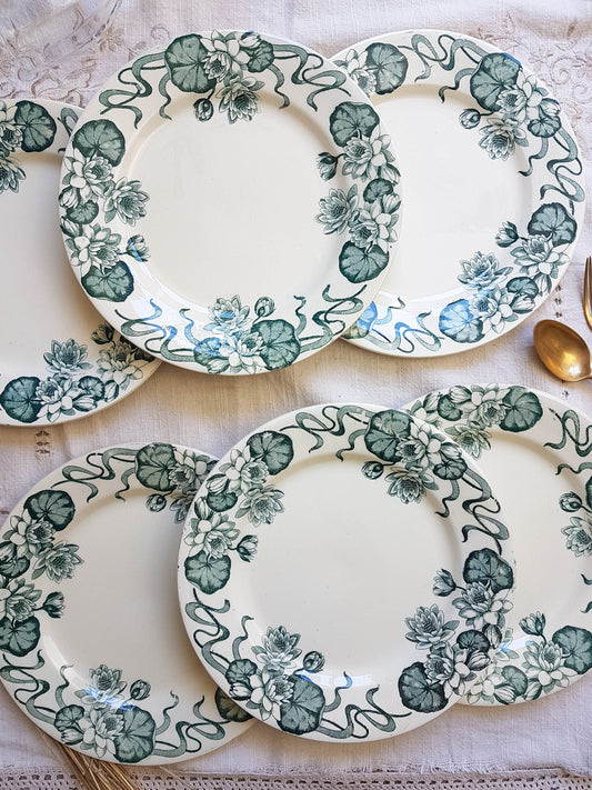 6 Vintage white and green porcelain dinner plates, Iris Moulin des Loups "Sargosse" 1950s.