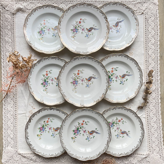8 Vintage, mismatched small plates in French Limoges porcelain, Orchies - Golden flower and bird motifs.