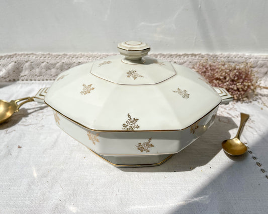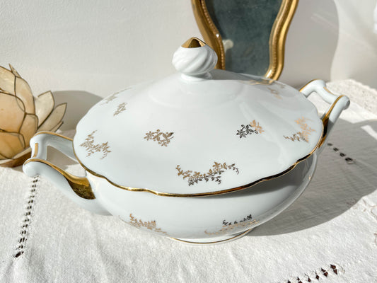Vintage white and yellow gold floral porcelain soup tureen L'Amandinoise 38754 France 1950s