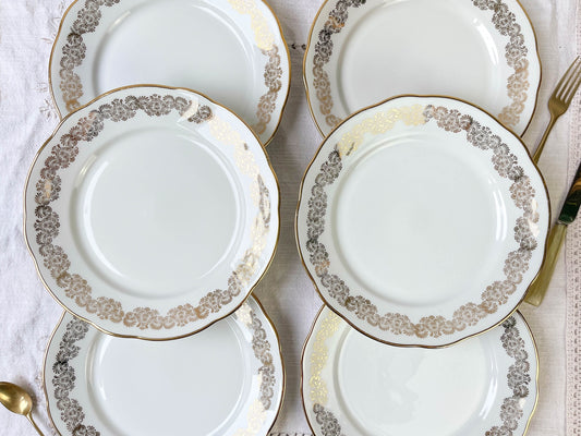 6 Vintage Porcelain Dinner Plates with a White and Gold Floral Pattern, L'Amandinoise "Coopélia" - Vintage Floral Tableware