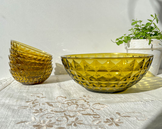 Vintage amber glass dessert set – 1 salad bowl + 5 matching coupes