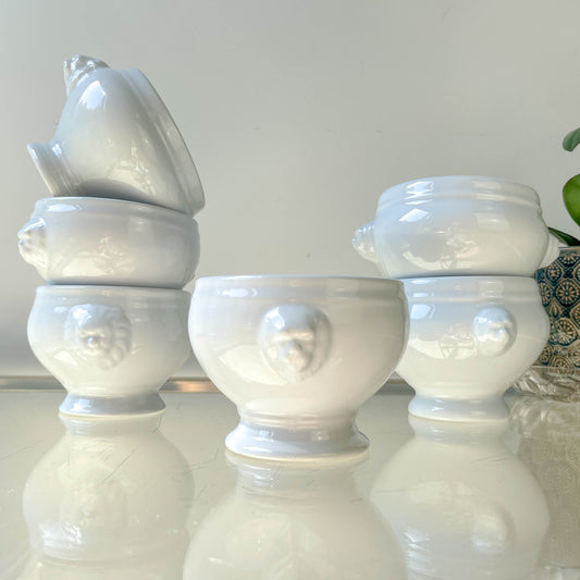 6 Vintage Lion Head Onion Soup Bowls in Porcelain, mismatched - White, Made in France
