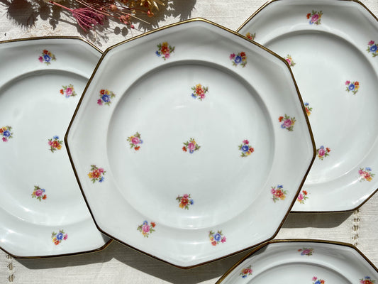 6 vintage porcelain soup plates, floral pattern, white and gold yellow, L'Amandinoise 3875
