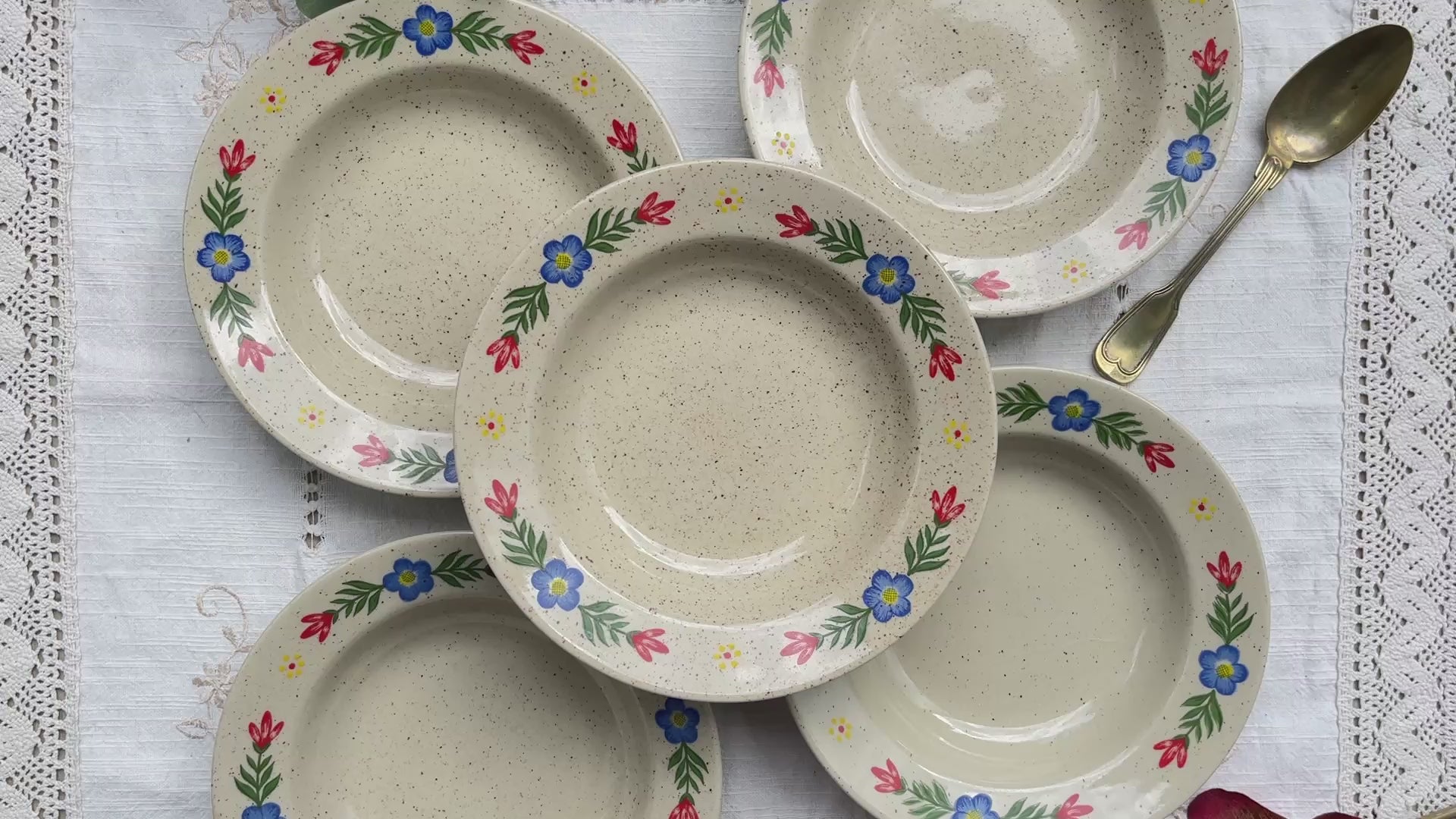 Set of 5 speckled beige earthenware soup plates from Tulowice, Poland, circa 1970. Colorful stoneware service decorated with a pretty wreath of red and blue flowers.