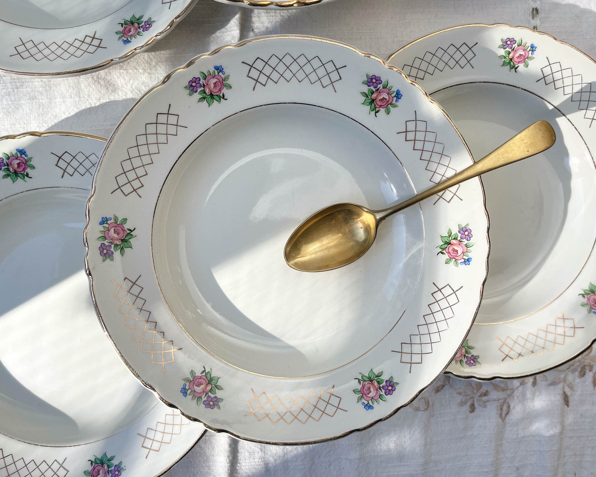 6 MOULIN DES LOUPS flowered earthenware soup plates, Cordoue model