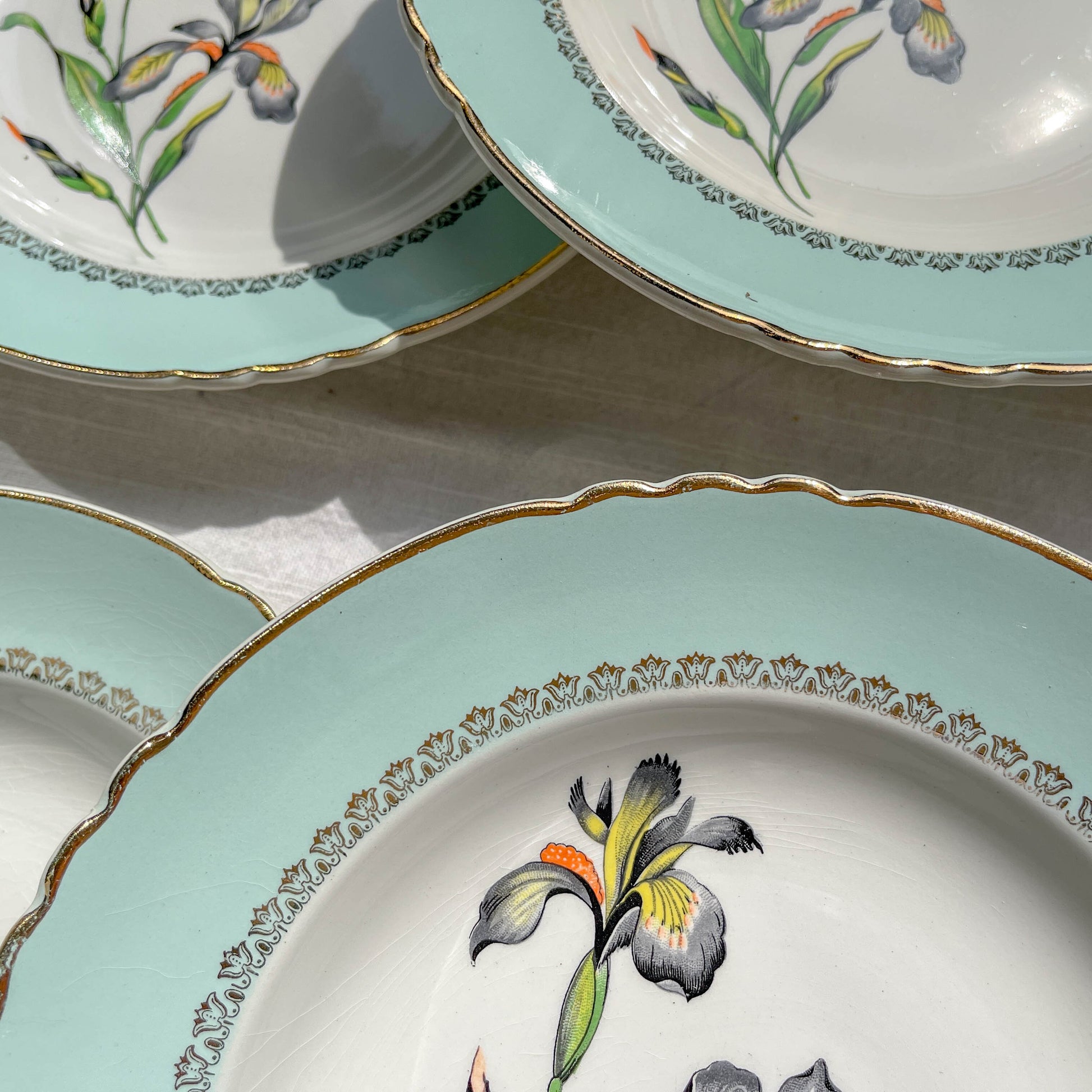 Elegant and delicate, these shallow plates in white porcelain are adorned with a green and gold border, enhanced by a refined floral pattern depicting a colorful iris.