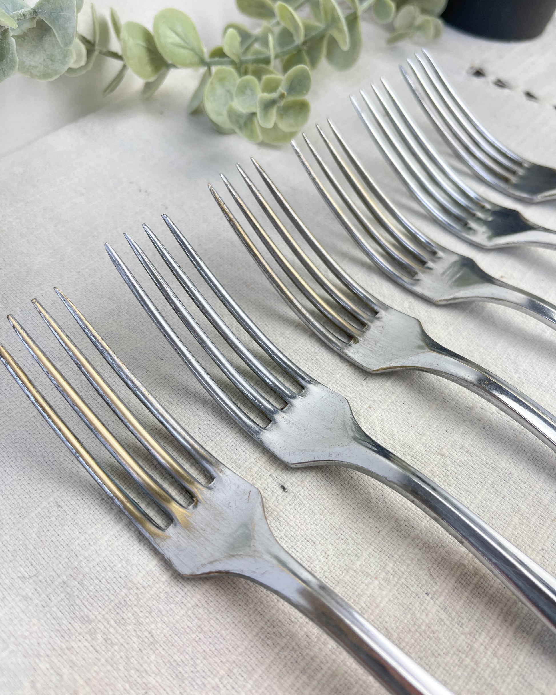 Add a retro and elegant touch to your table with this set of 6 vintage stainless steel forks by VLM Italia. Their Art Deco-style stamped handles give them a unique charm, ideal for complementing antique tableware or a refined table setting.