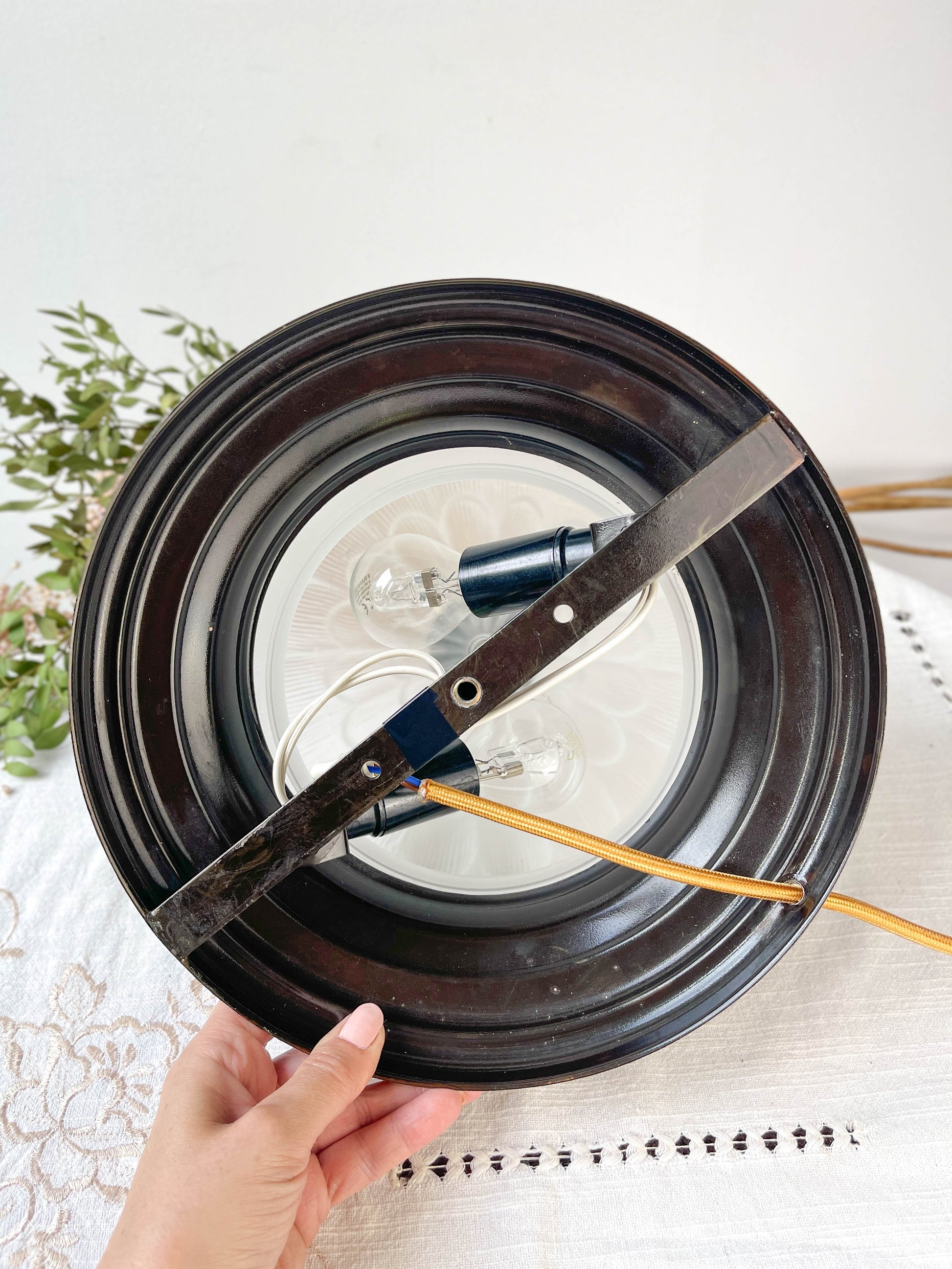 Old ceiling light subtly transformed into a table lamp.