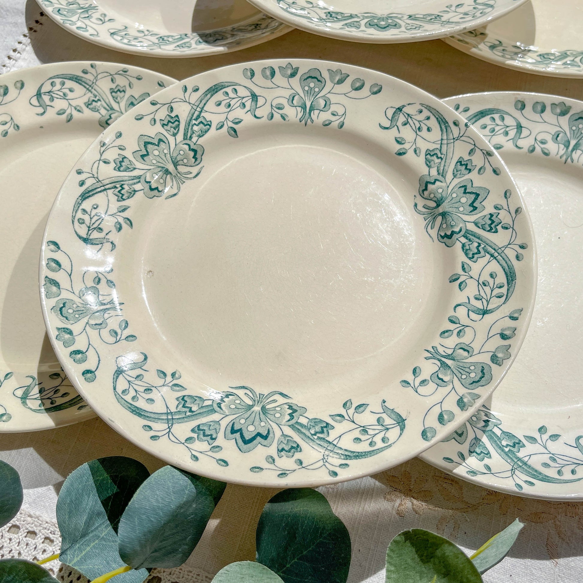 Chaque assiette est décorée d’un délicat motif floral bleu en transfert, représentant des feuilles de figuiers, sur une faïence blanche raffinée. Ce service authentique du XIXe siècle incarne tout le charme de l’art de la table à la française.