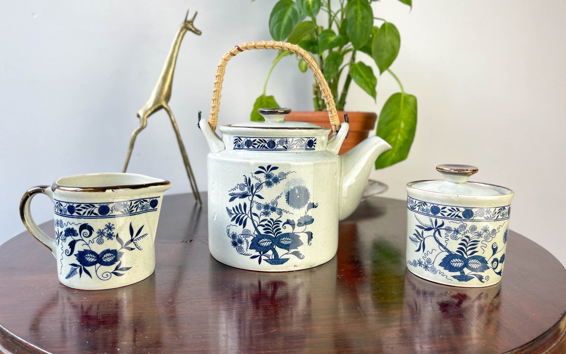 Japanese stoneware tea set with Blue Danube "Blue Onion" pattern