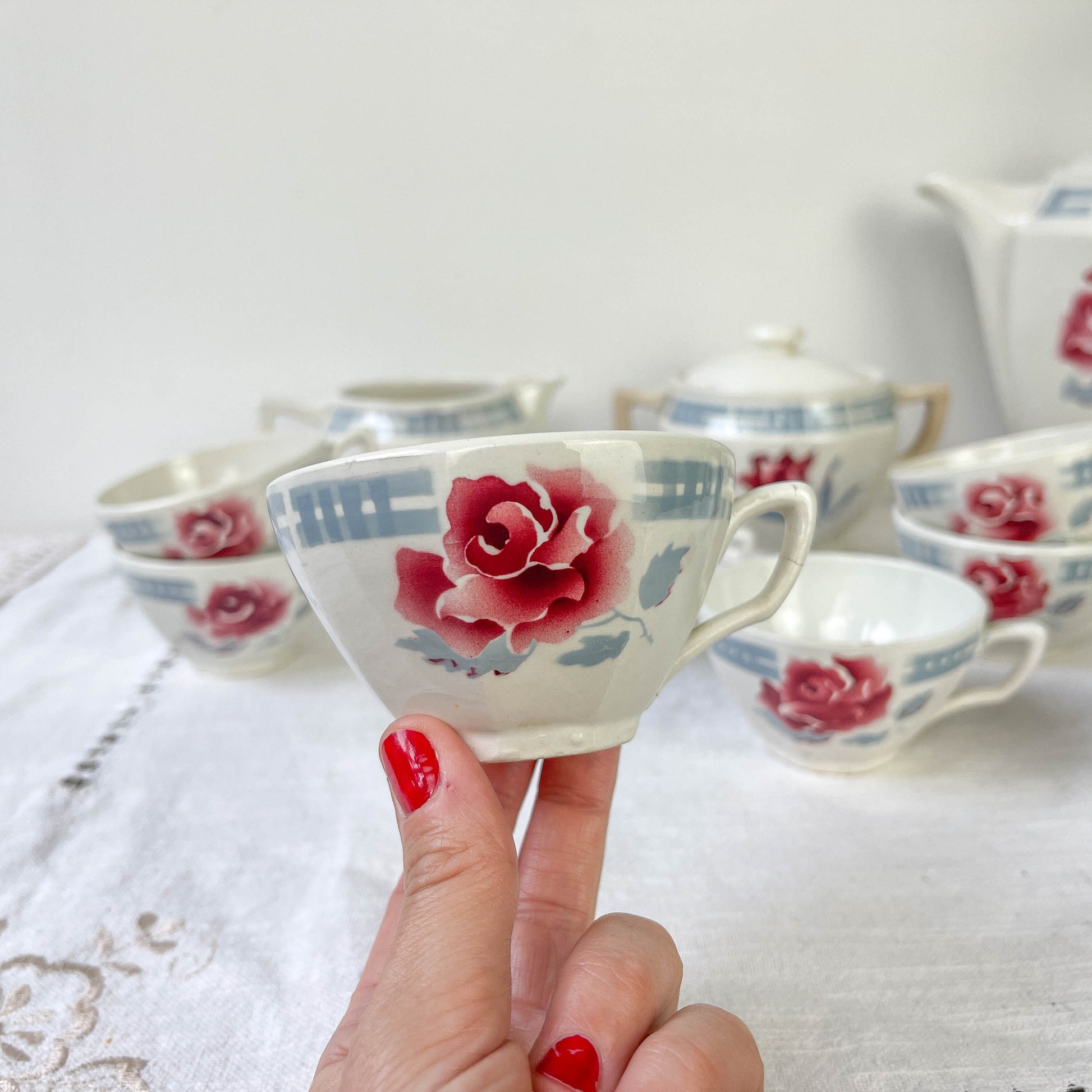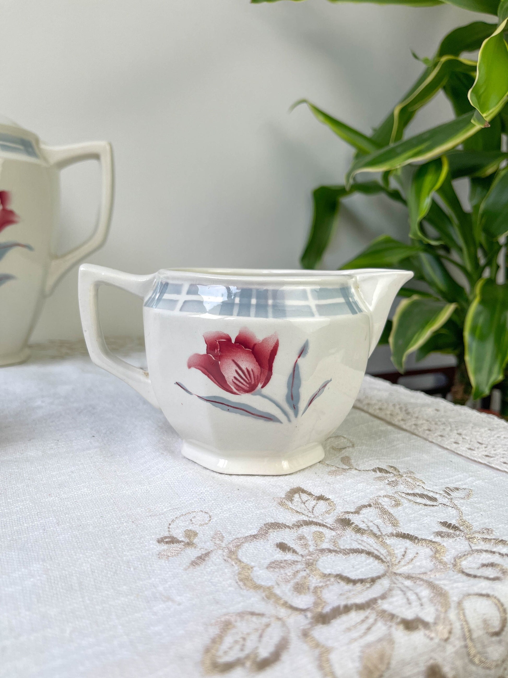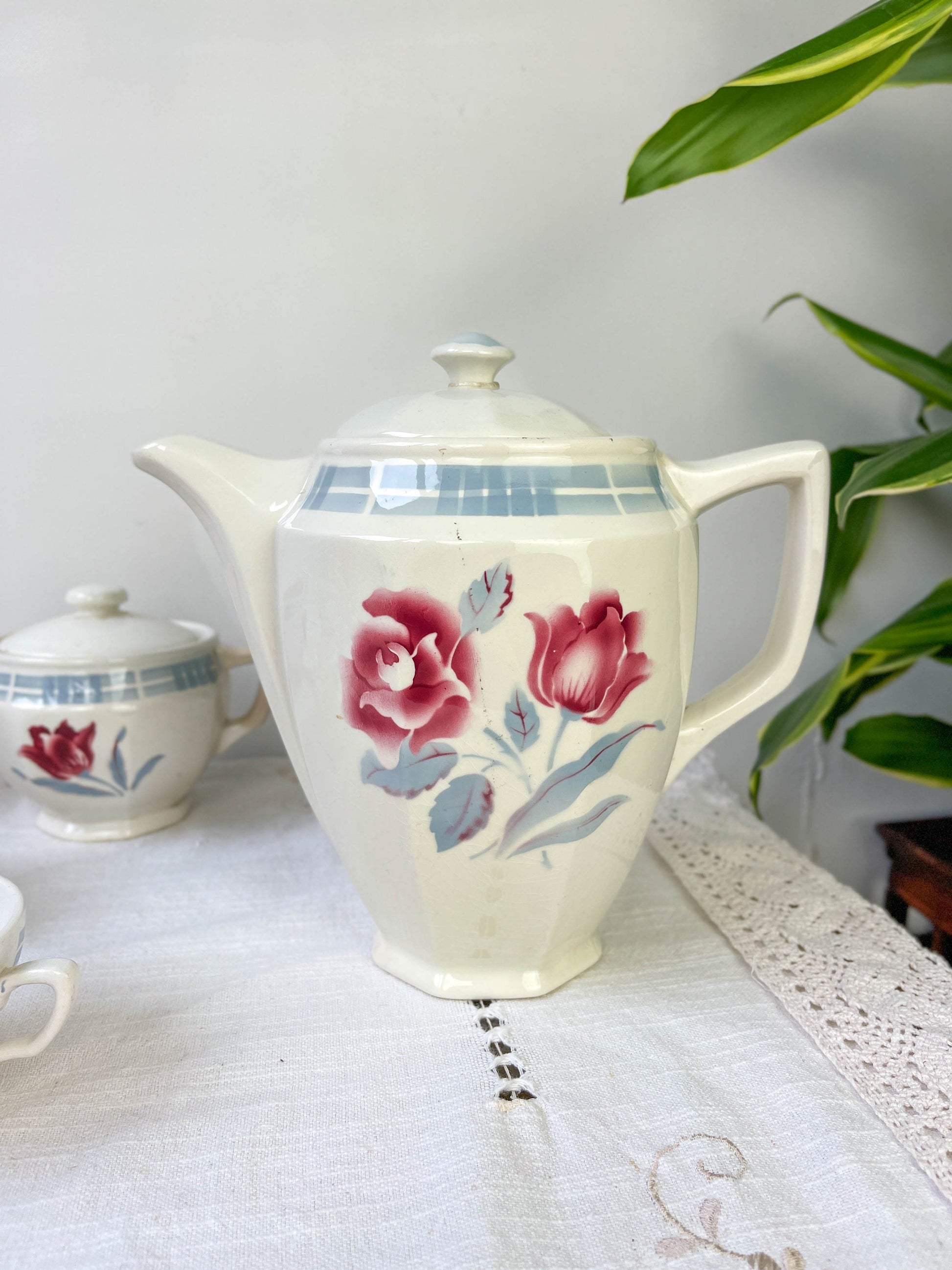 Vintage SARREGUEMINES tea set in flowered earthenware, TROYES model