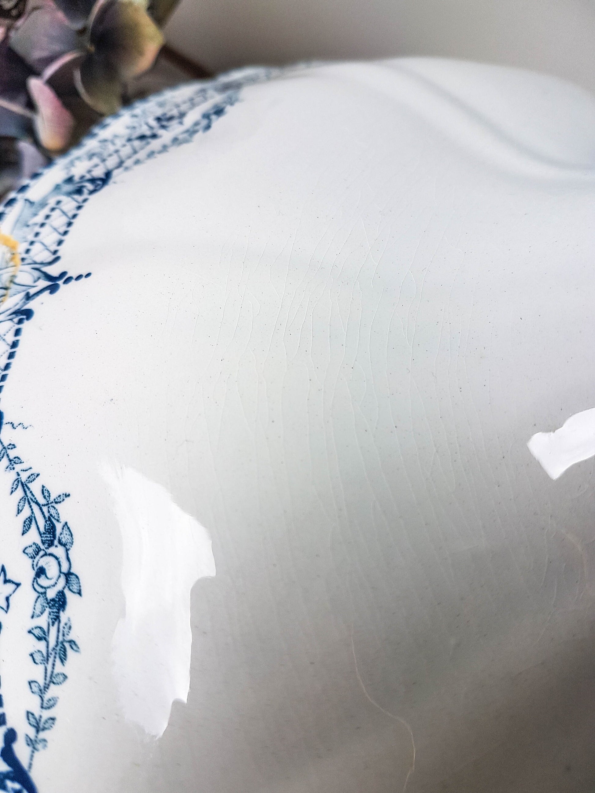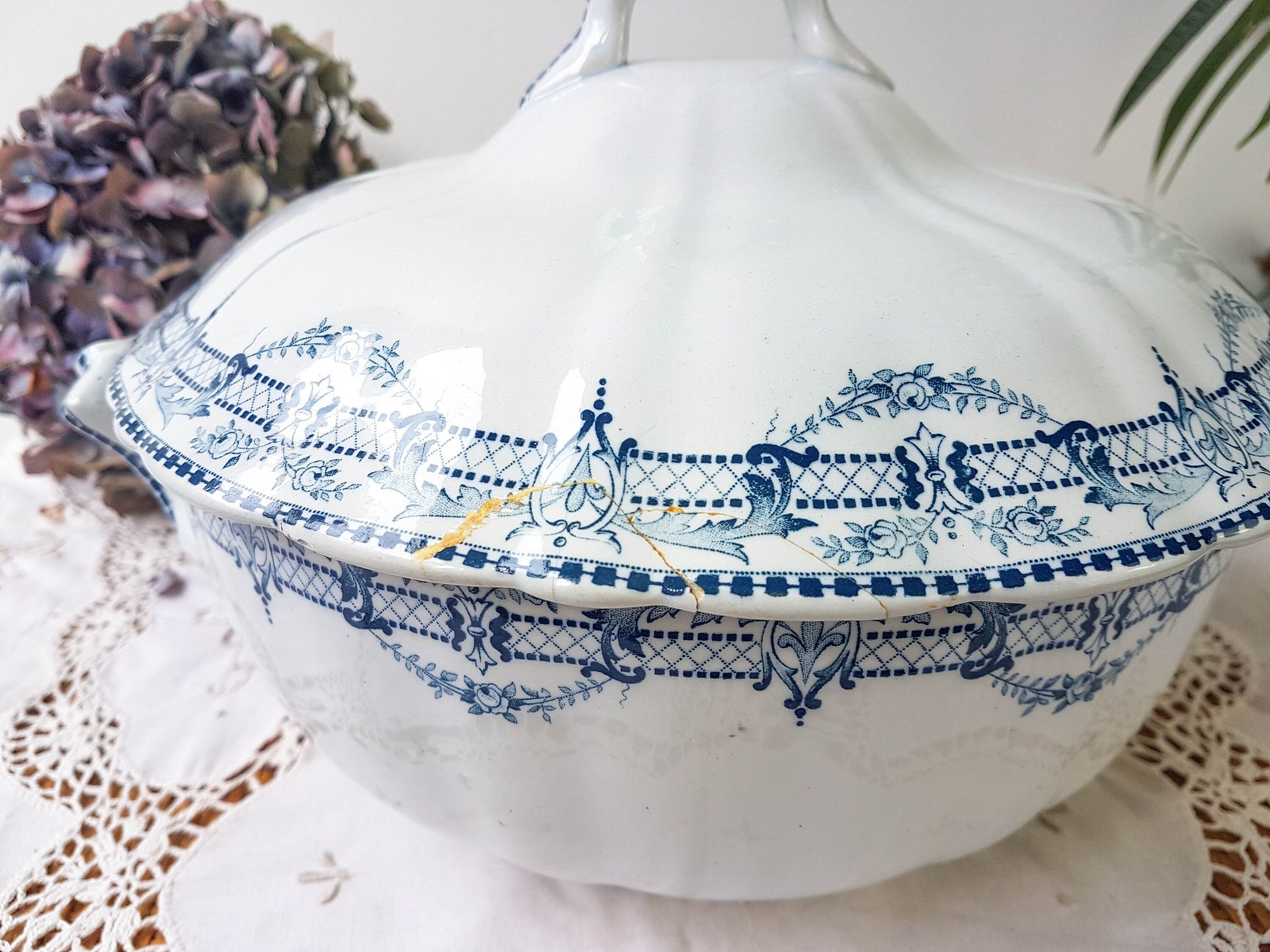 → Average condition. It is enameled and has a break that was glued back by its previous owner. A small break also inside and on the lid.