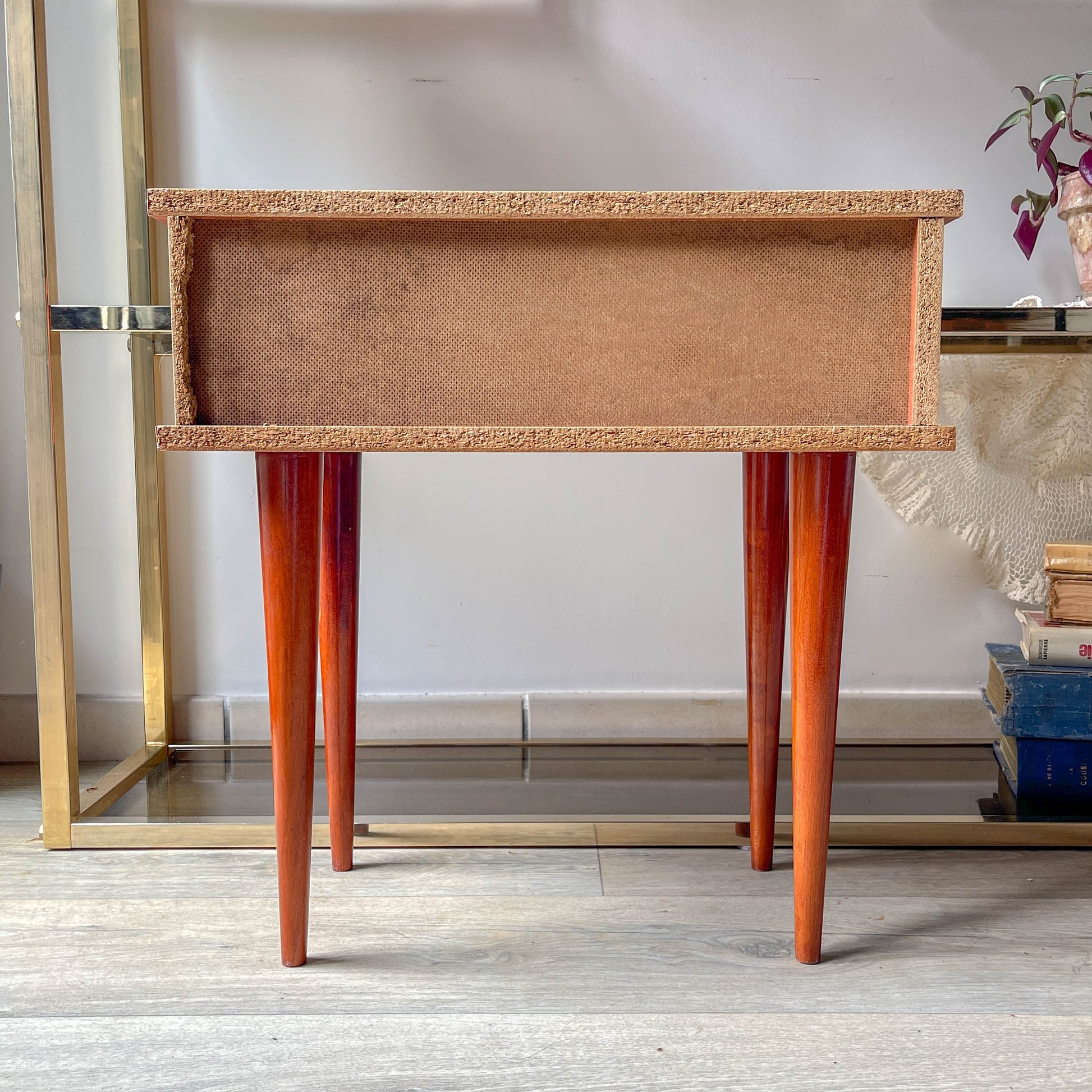 Minimalist design in formica, tapered legs and small gold-plated brass handle.