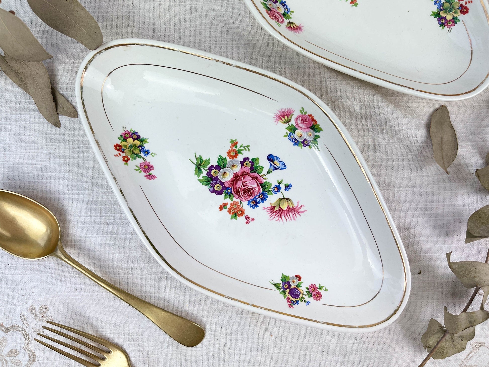 Porcelaine blanche et motif fleuris coloré. Idéale pour présenter vos apéritifs, biscuit ou même en vide poche dans une entrée !