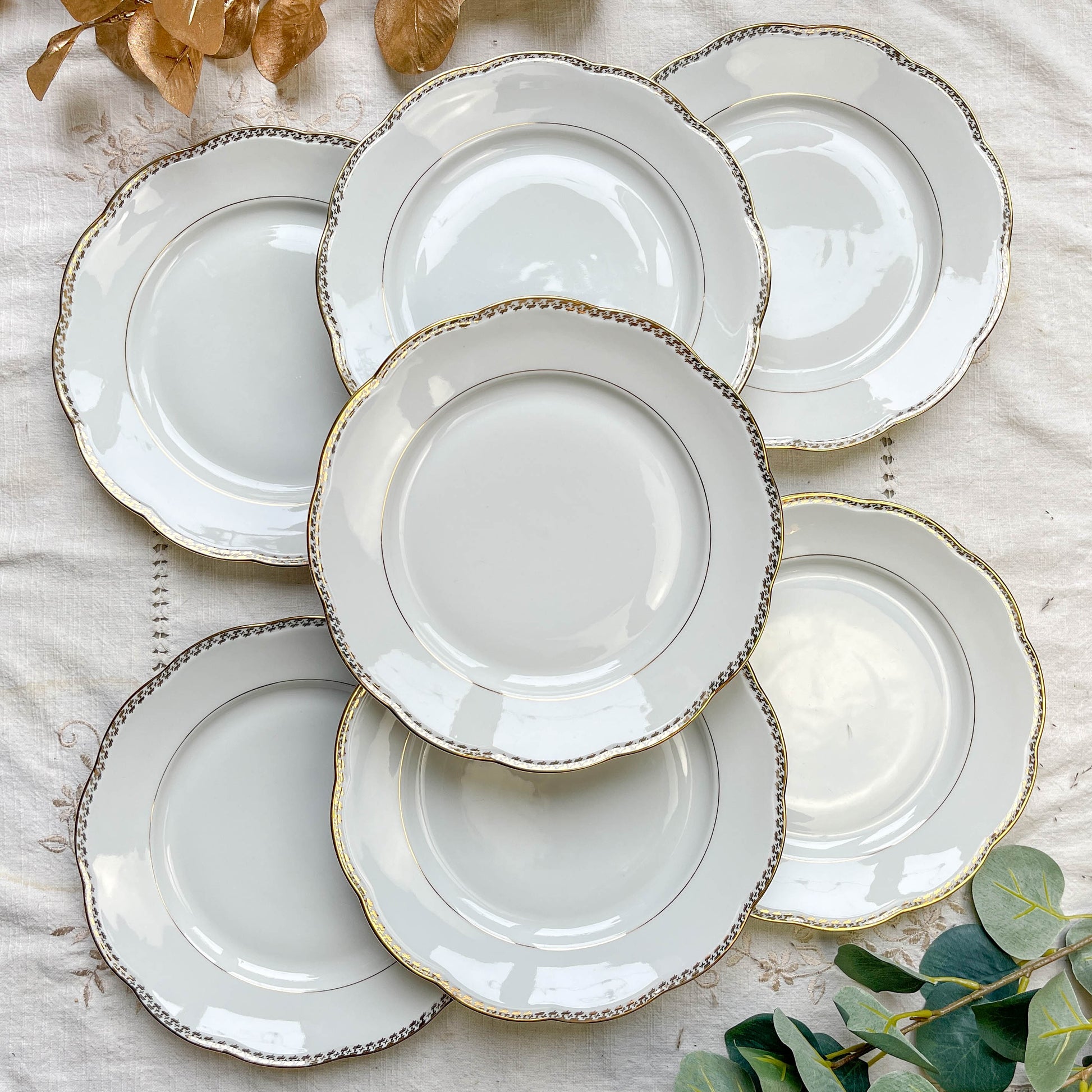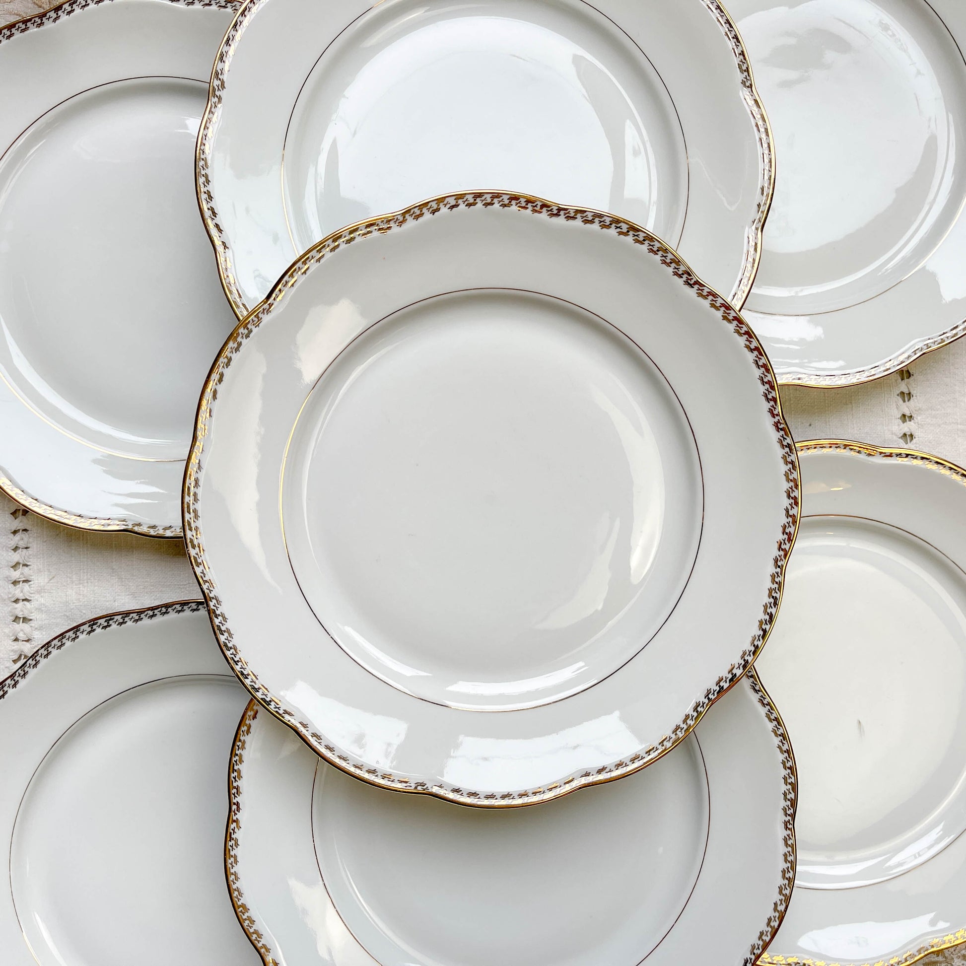7 Assiettes plates vintage en porcelaine blanche et dorée SPF – Motifs géométriques