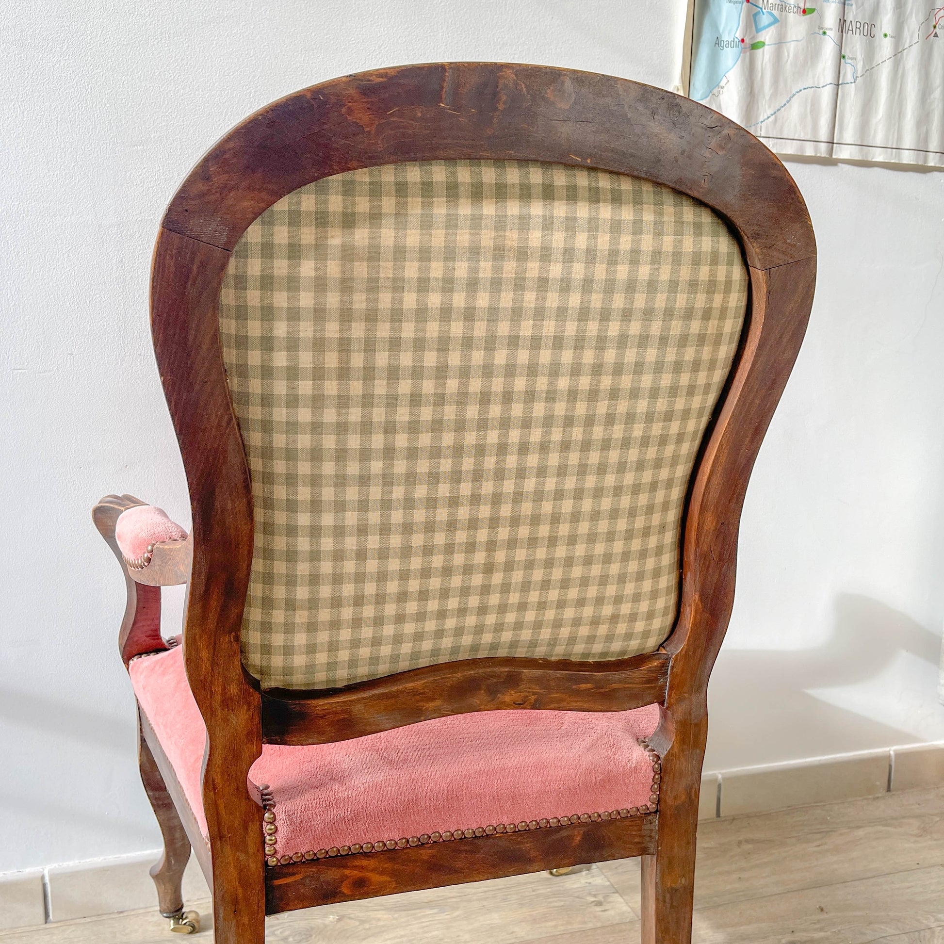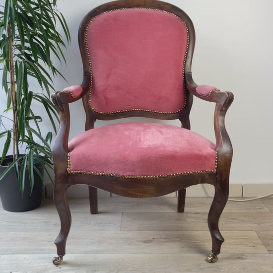 Fauteuil Louis Philippe velours rose - Fauteuil ancien XIXe - Décoration romantique vintage - Siège antique bois sculpté